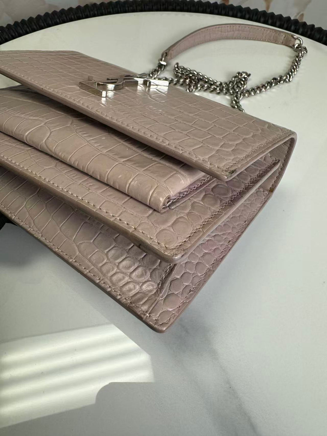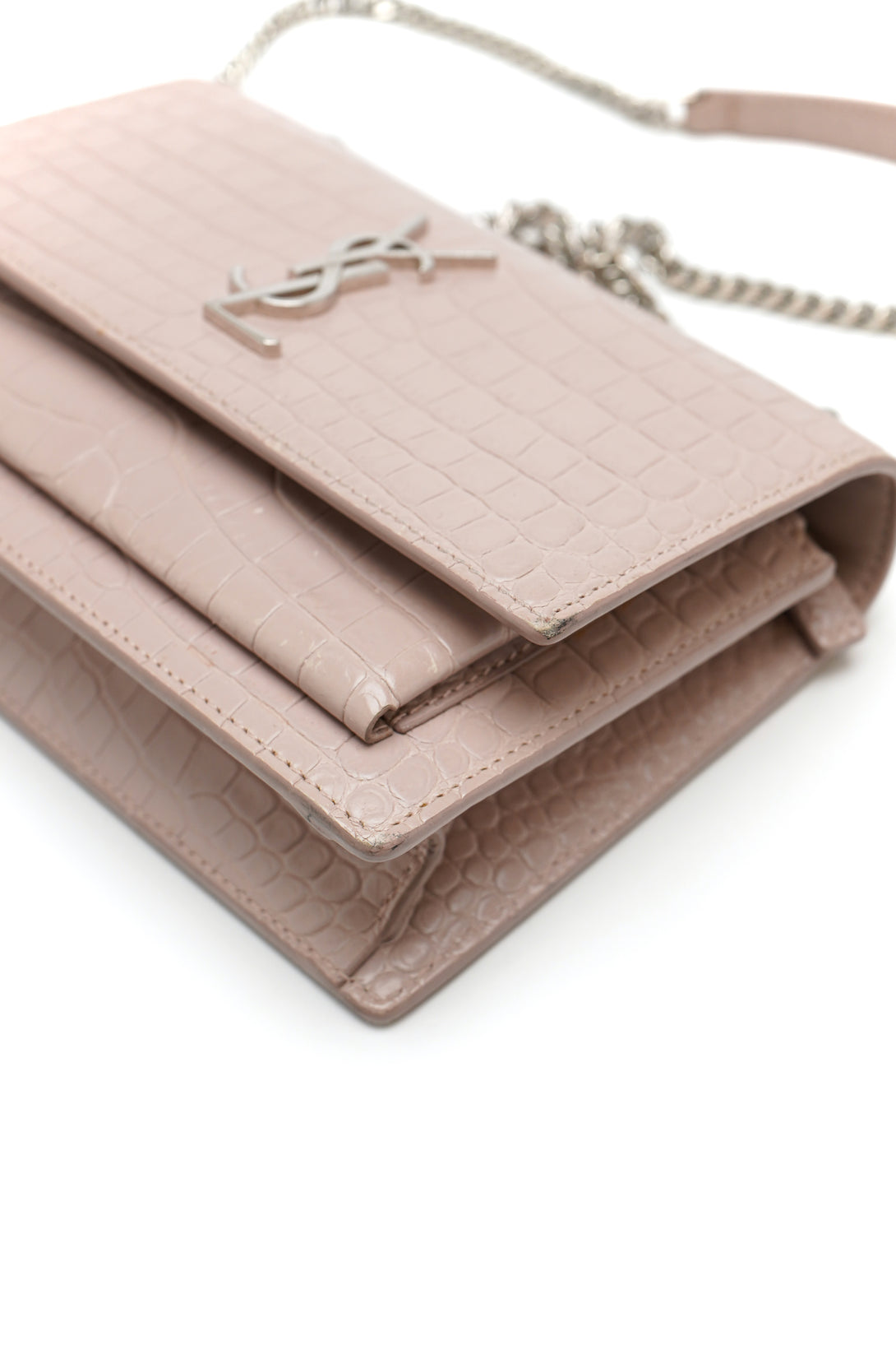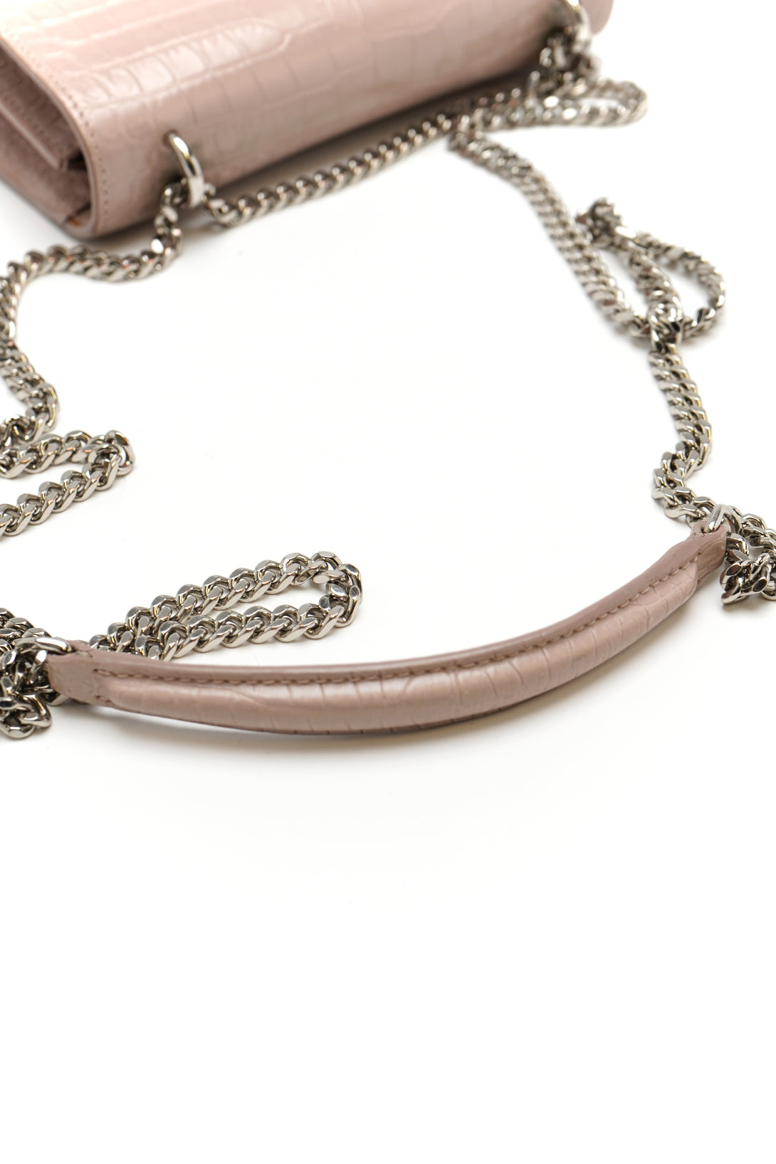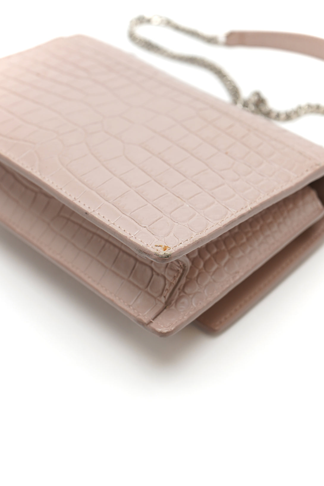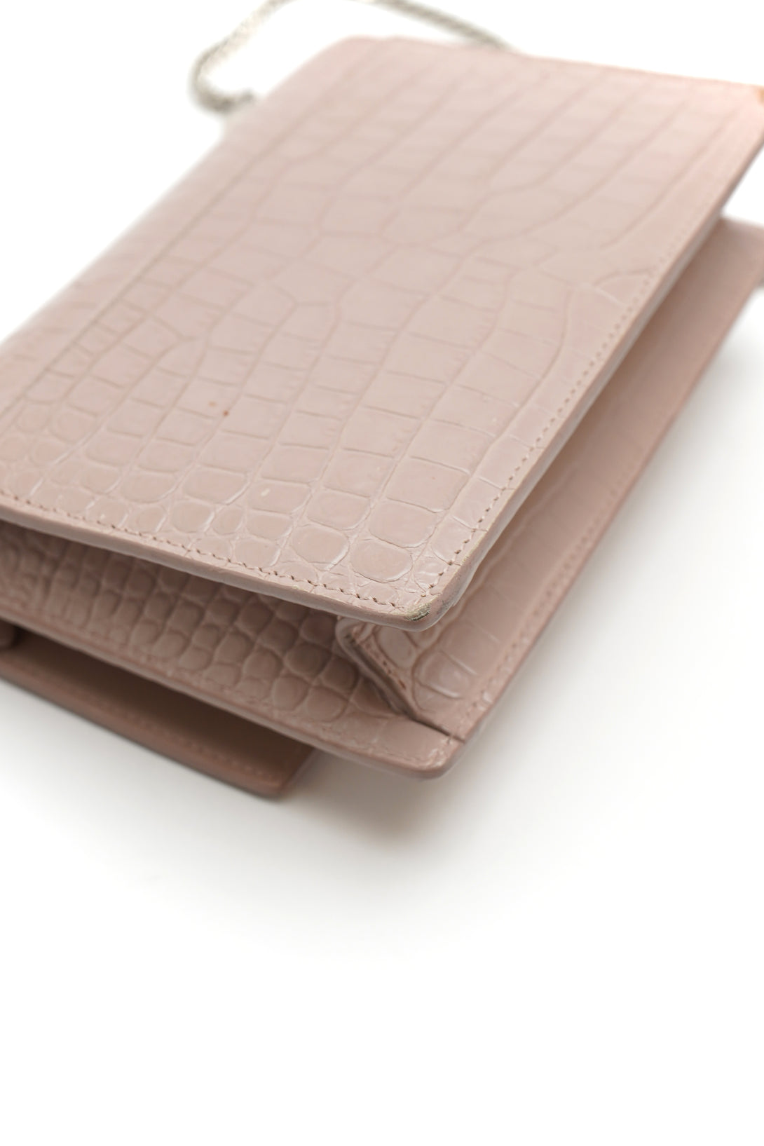 Saint Laurent Calfskin Crocodile Embossed Monogram Sunset Chain Wallet Marble Pink