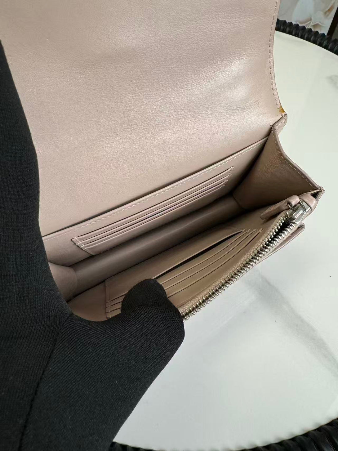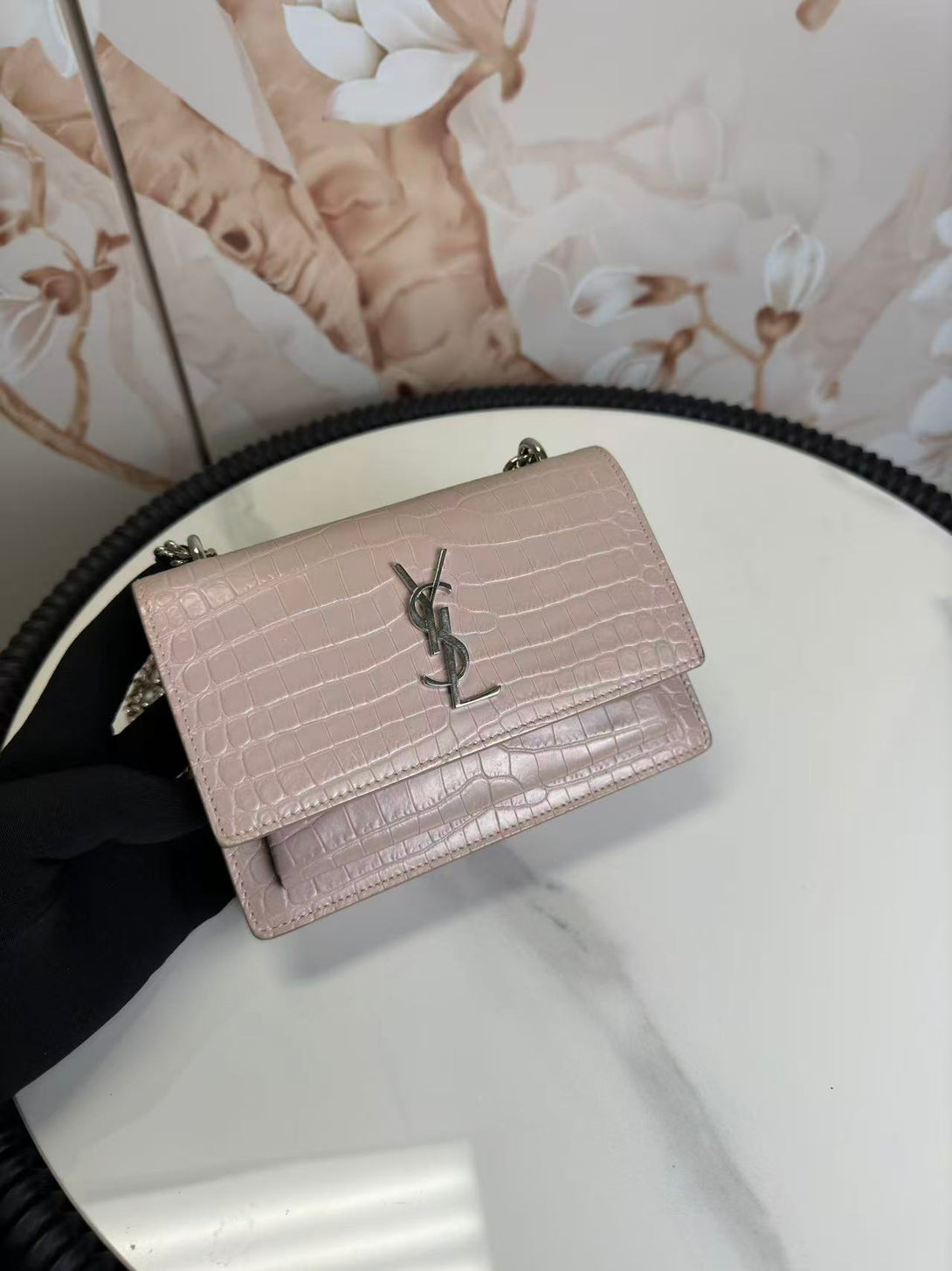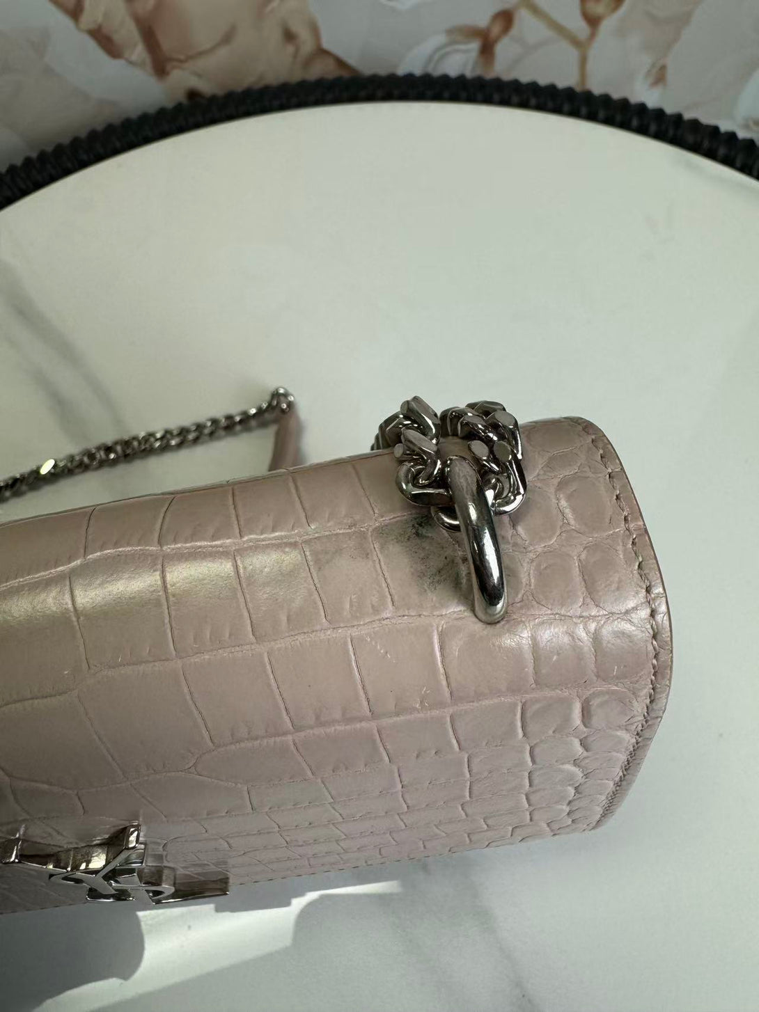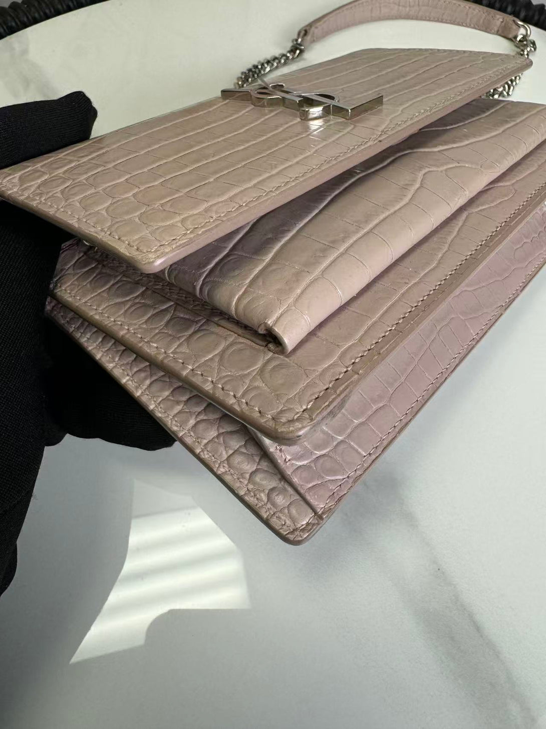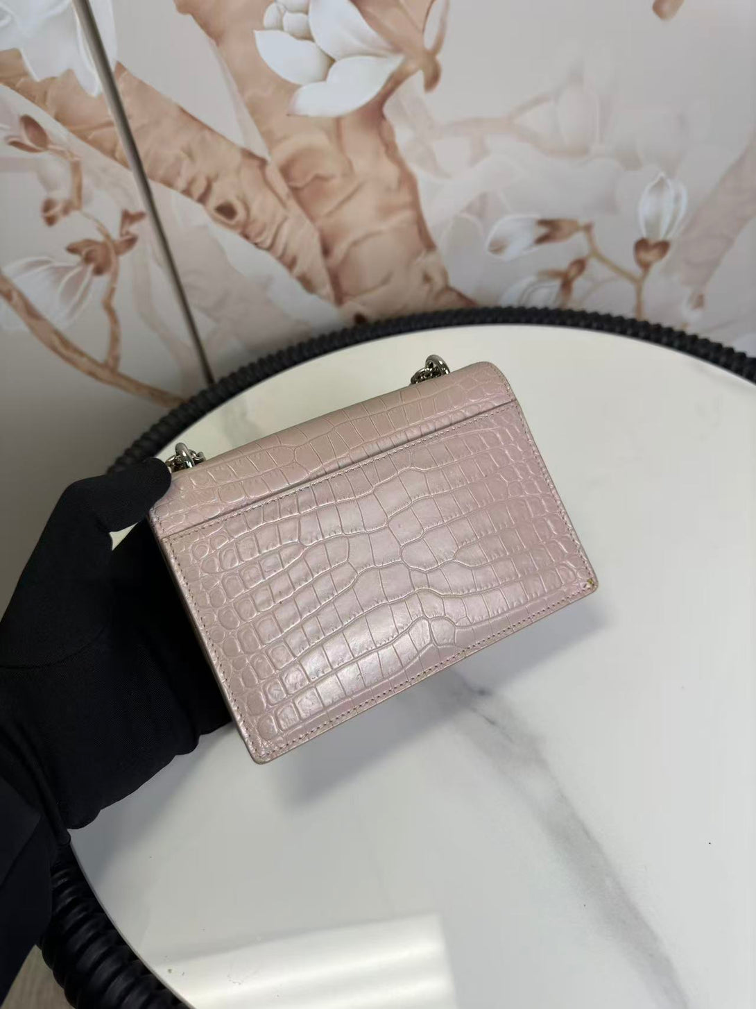 Saint Laurent Calfskin Crocodile Embossed Monogram Sunset Chain Wallet Marble Pink