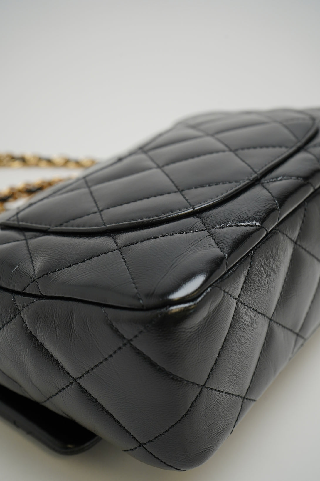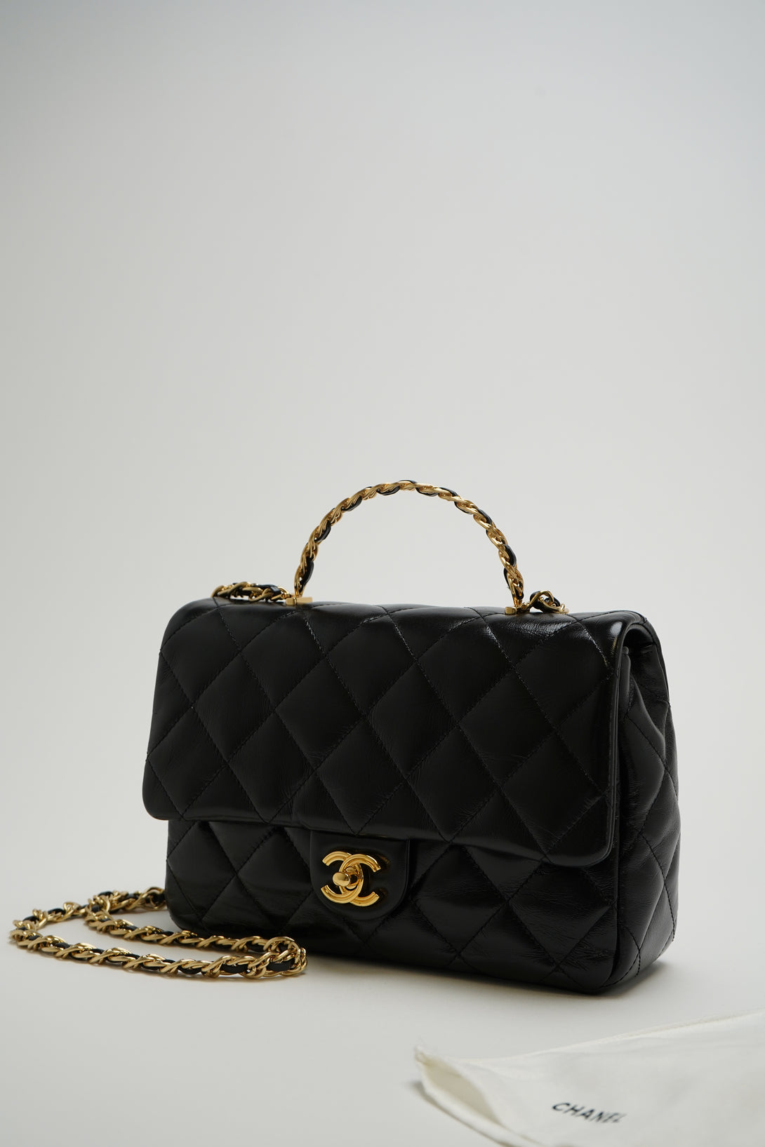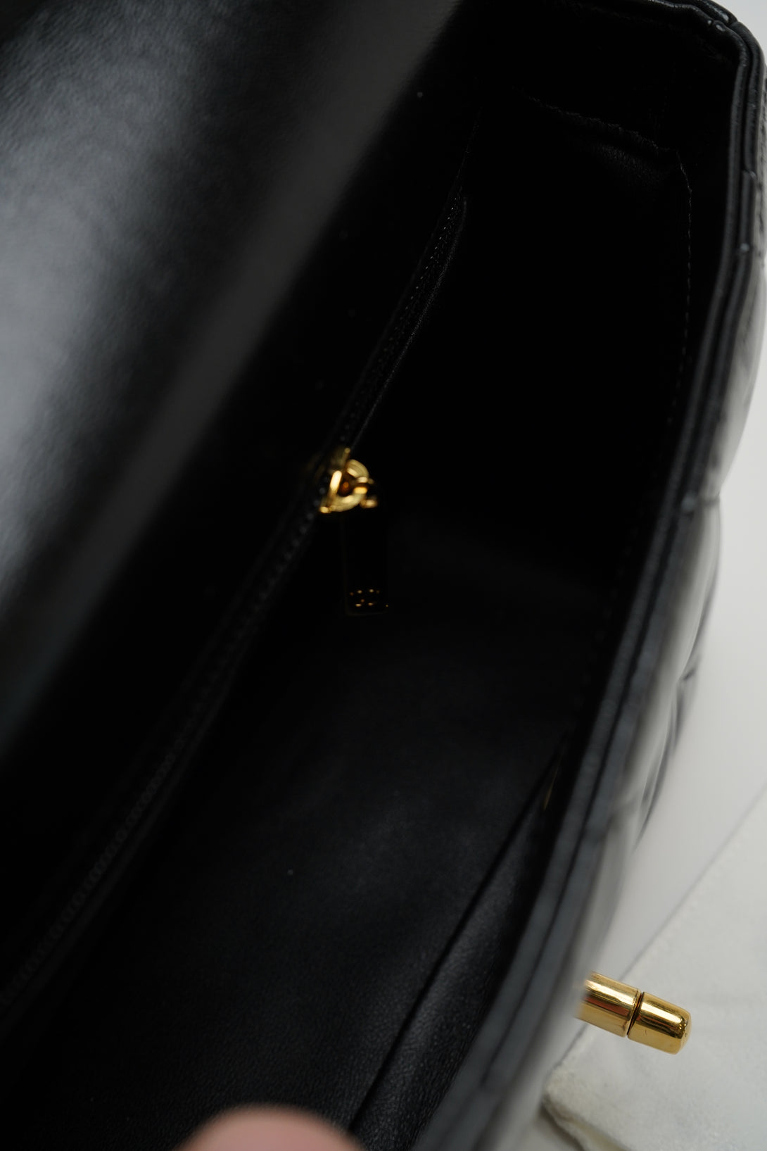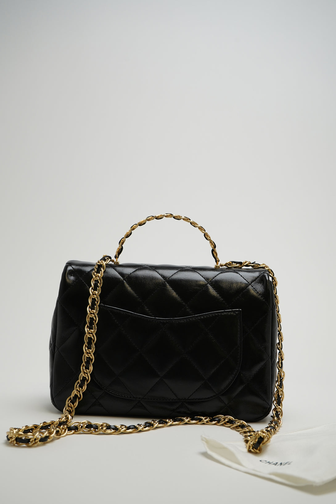 Chanel 23s Shiny Lambskin Quilted Golden Links Top Handle Flap Black Medium