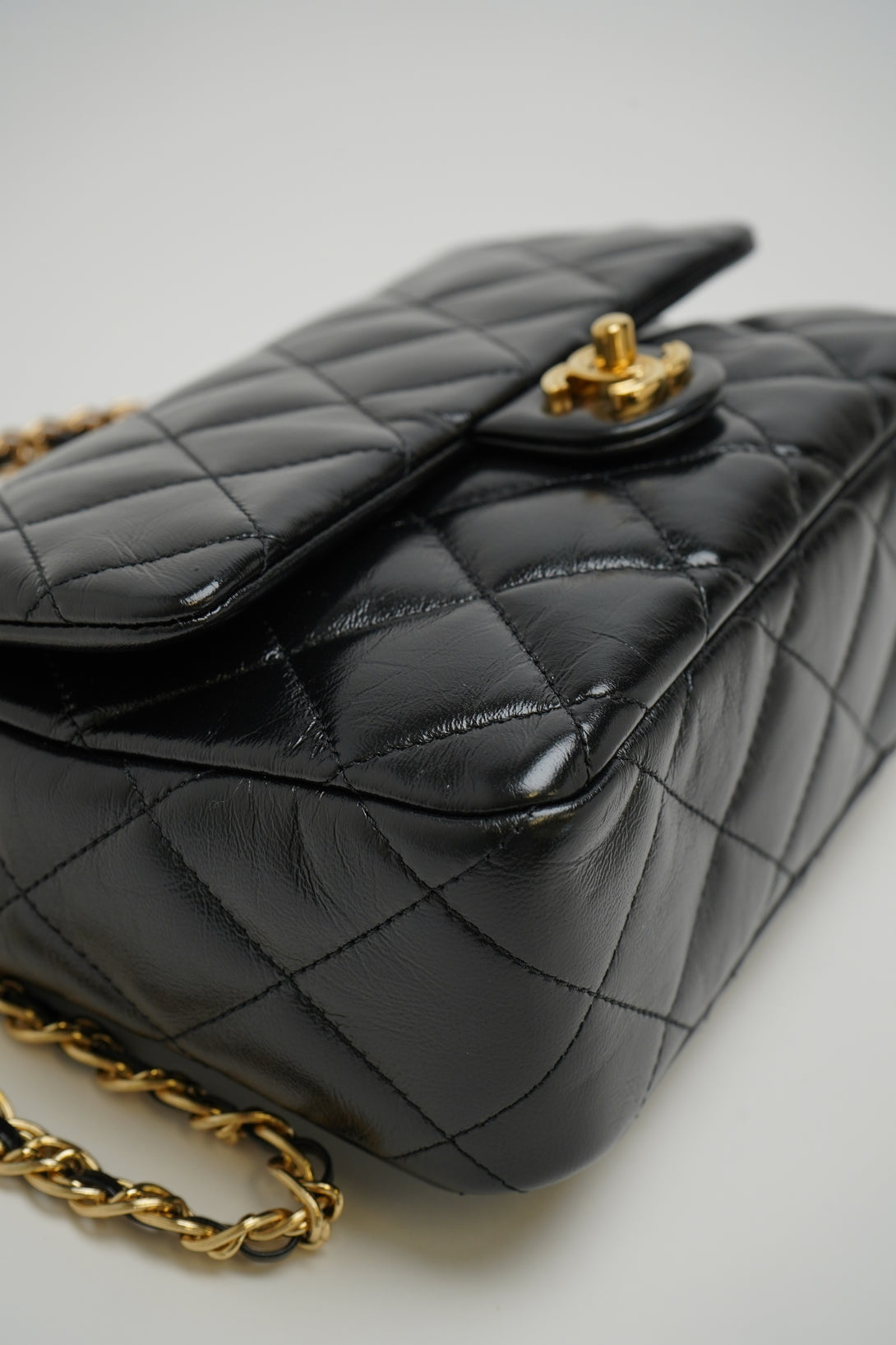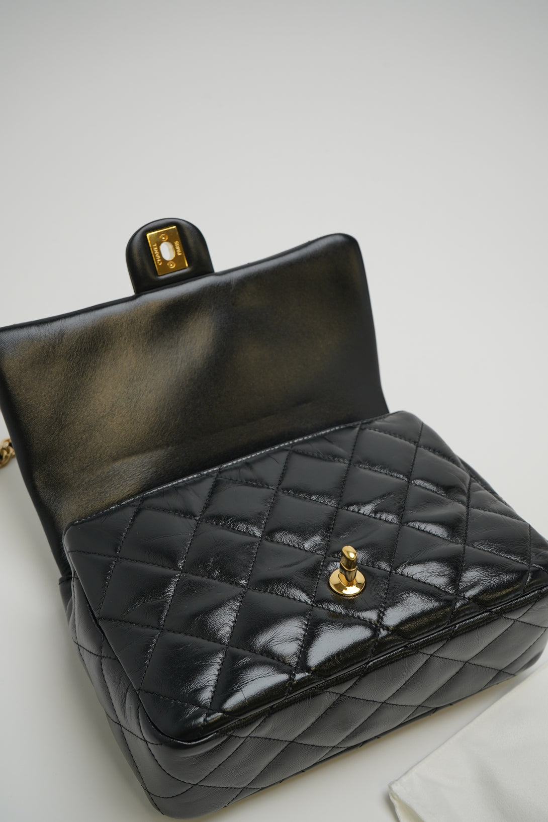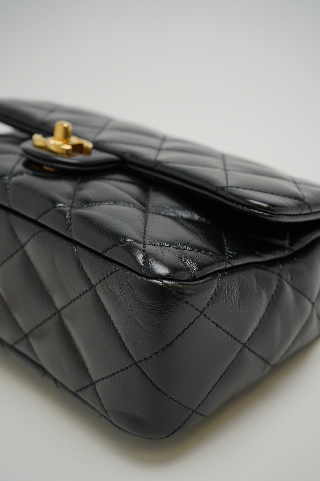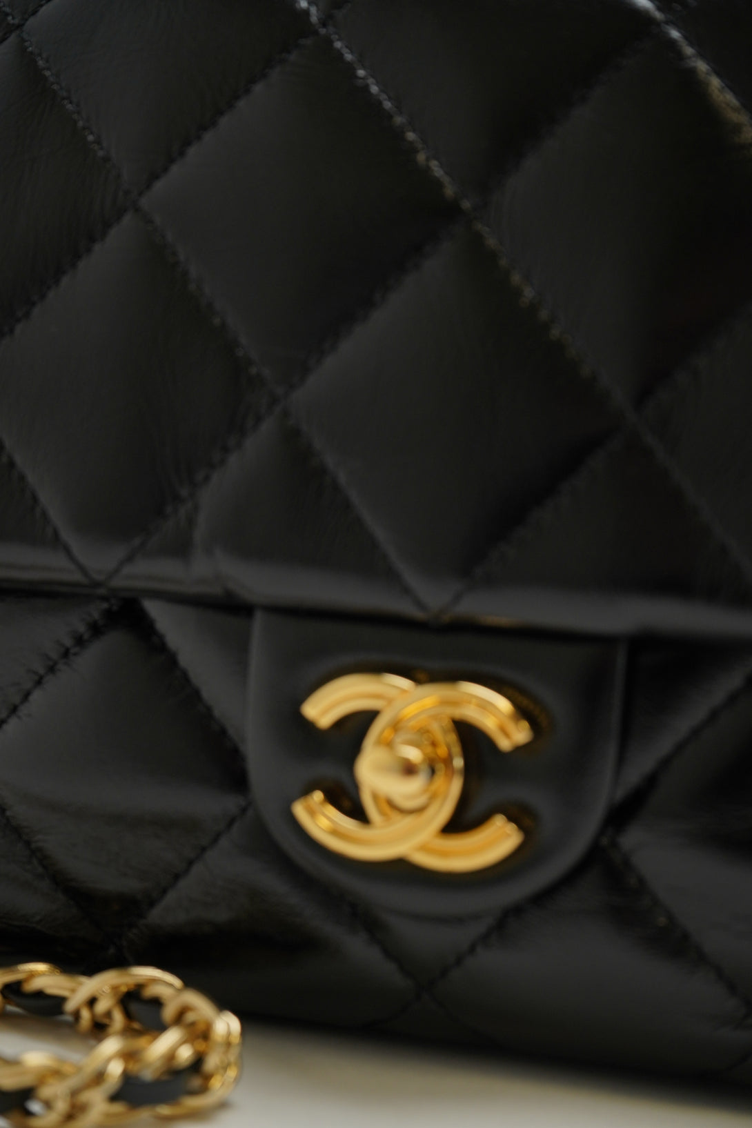 Chanel 23s Shiny Lambskin Quilted Golden Links Top Handle Flap Black Medium